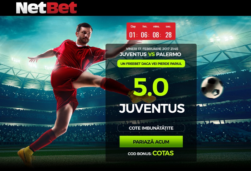 - Pentru Cota 5 la victorie Juventus cu Palermo, Click pe Acest Link sau pe imaginea de jos cu Juventus si deschide un cont nou la Netbet!