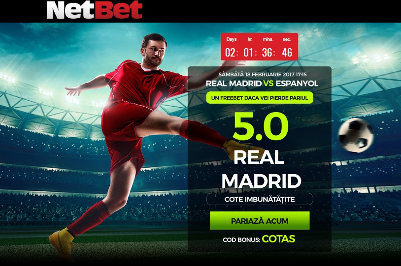 3. Pentru cota 5.0 la victorie Real cu Espanyol, Click pe acest Link sau pe imaginea de mai jos cu Real si deschide un cont nou la Netbet!