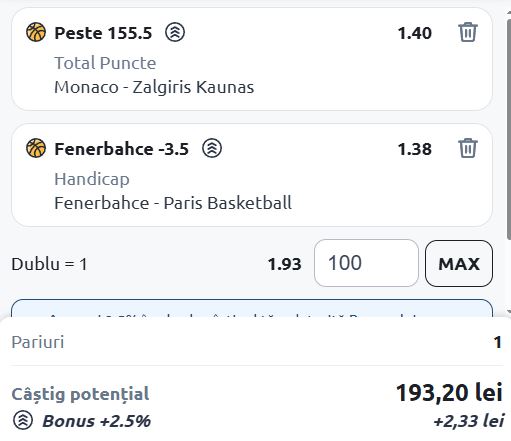 Pentru azi am pregătit un bilet din baschet care ne poate dubla miza jucată. Acesta conține sugestii de pariere din Euroliga.