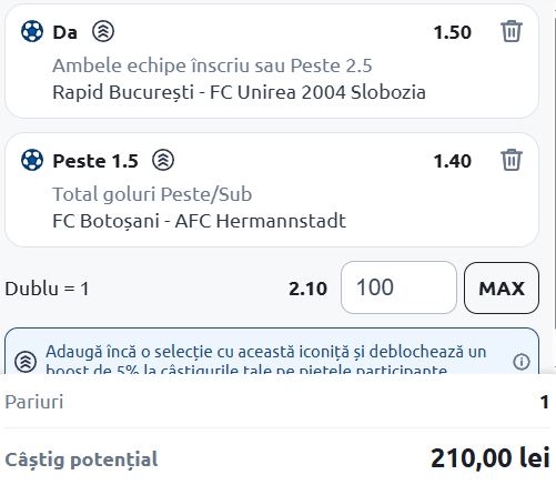 Biletul meu are astăzi o cotă totală de 2.10, compusă cu sugestii de pariere pentru meciurile zilei din Superliga.