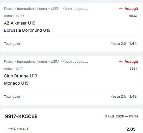 MRS ne propune un bilet ce ne poate dubla miza jucată, format cu sugestii de pariere pentru meciuri din UEFA Youth League.
