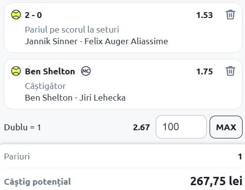 Pentru pariul din tenis am ales două meciuri de la ATP Cincinnati. Biletul format are o cotă de 2.67.