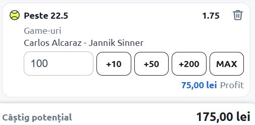 Pariul zilei din tenis vine de la finala Turneului Campionilor, acolo unde se vor duela Alcaraz și Sinner.