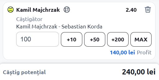WIN și pariul din tenis de ieri! Azi mizăm pe duelul de la ATP Winston-Salem dintre Kamil Majchrzak și Sebastian Korda, iar cota pariului este de 2.40.