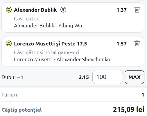Pariul din tenis vine într-o cotă de 2.15 și conține pronosticuri de la ATP Chengdu și Hangzhou.