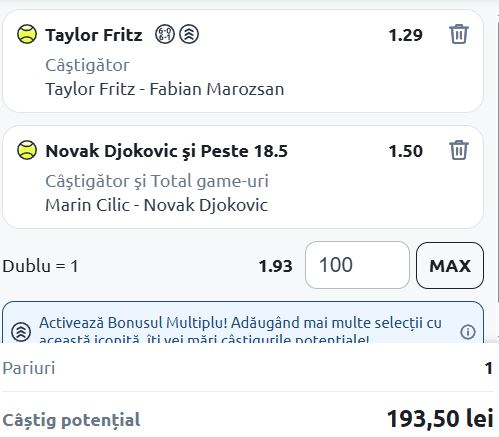Pariul din tenis conține pronosticuri de la ATP Shanghai, iar cota lui este una de 1.93.