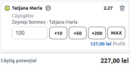 Pariul zilei din tenis vine de la duelul dintre Sonmez și Tatjana Maria, meci din cadrul turneului WTA Guadalajara.